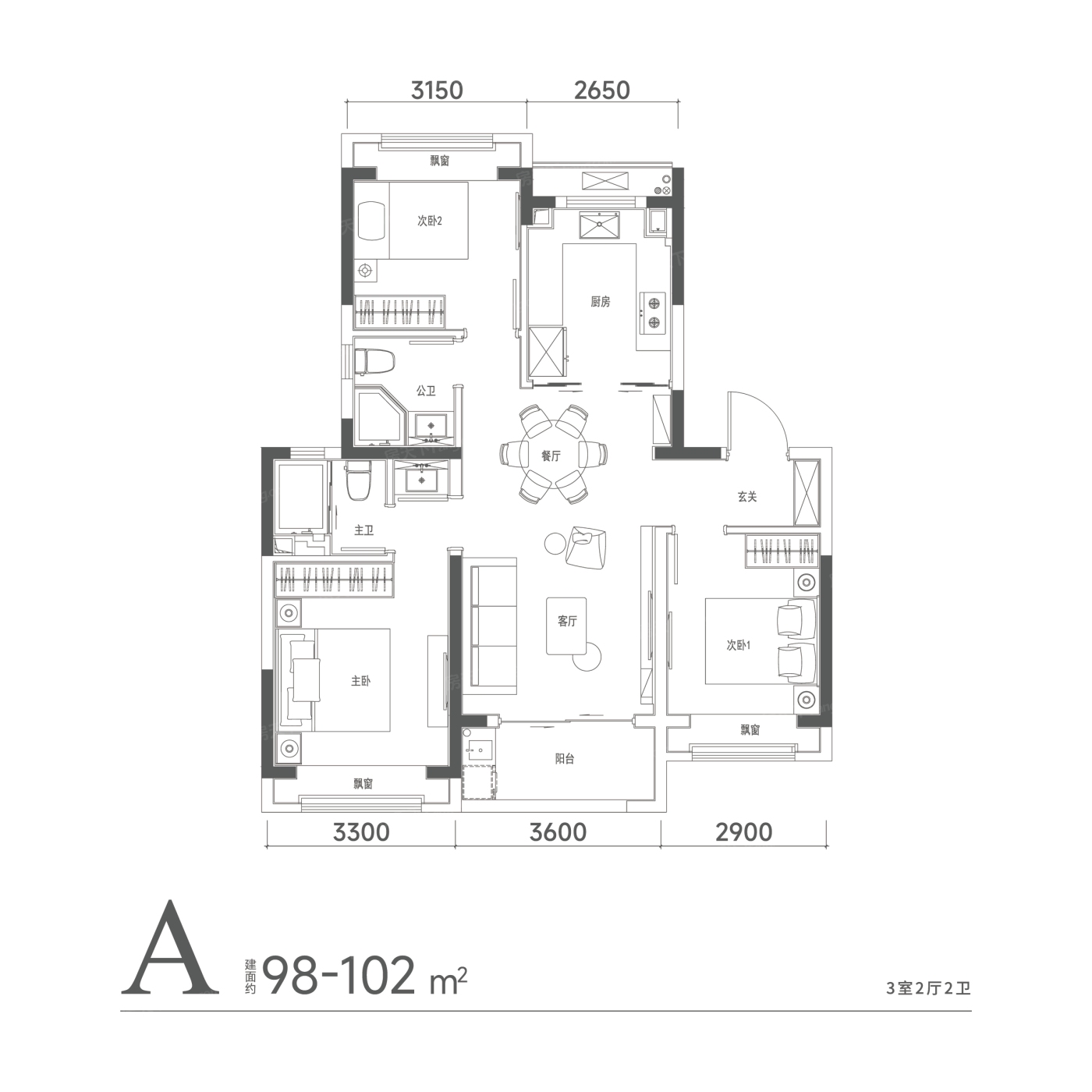 3室2厅1厨2卫 建面98.00㎡